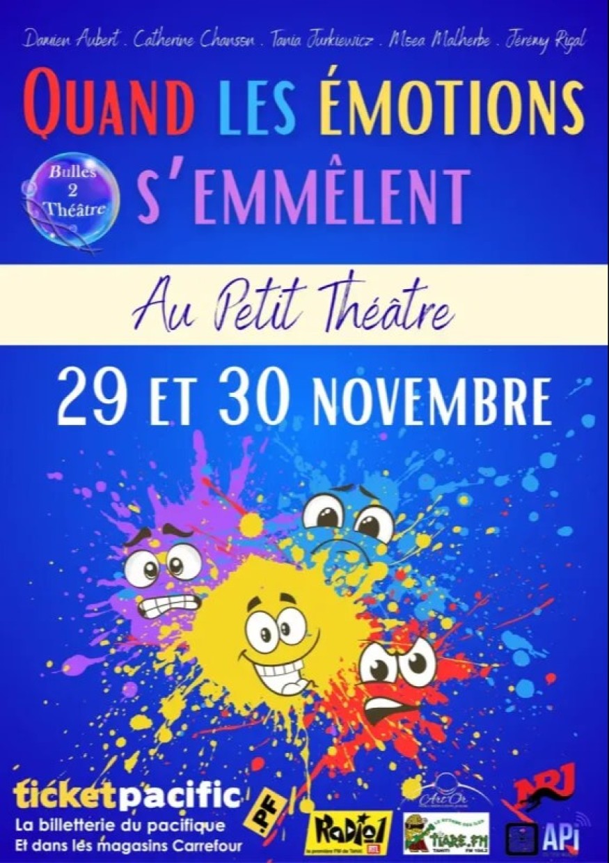 La compagnie Bulles 2 Théâtre revient sur les planches avec une création sensible et lumineuse, « Quand les émotions s’emmêlent », qui sera jouée au Petit Théâtre de la Maison de la Culture à Papeete les samedi 29 novembre 2025 à 18h30 et dimanche 30 novembre 2025 à 17h00.